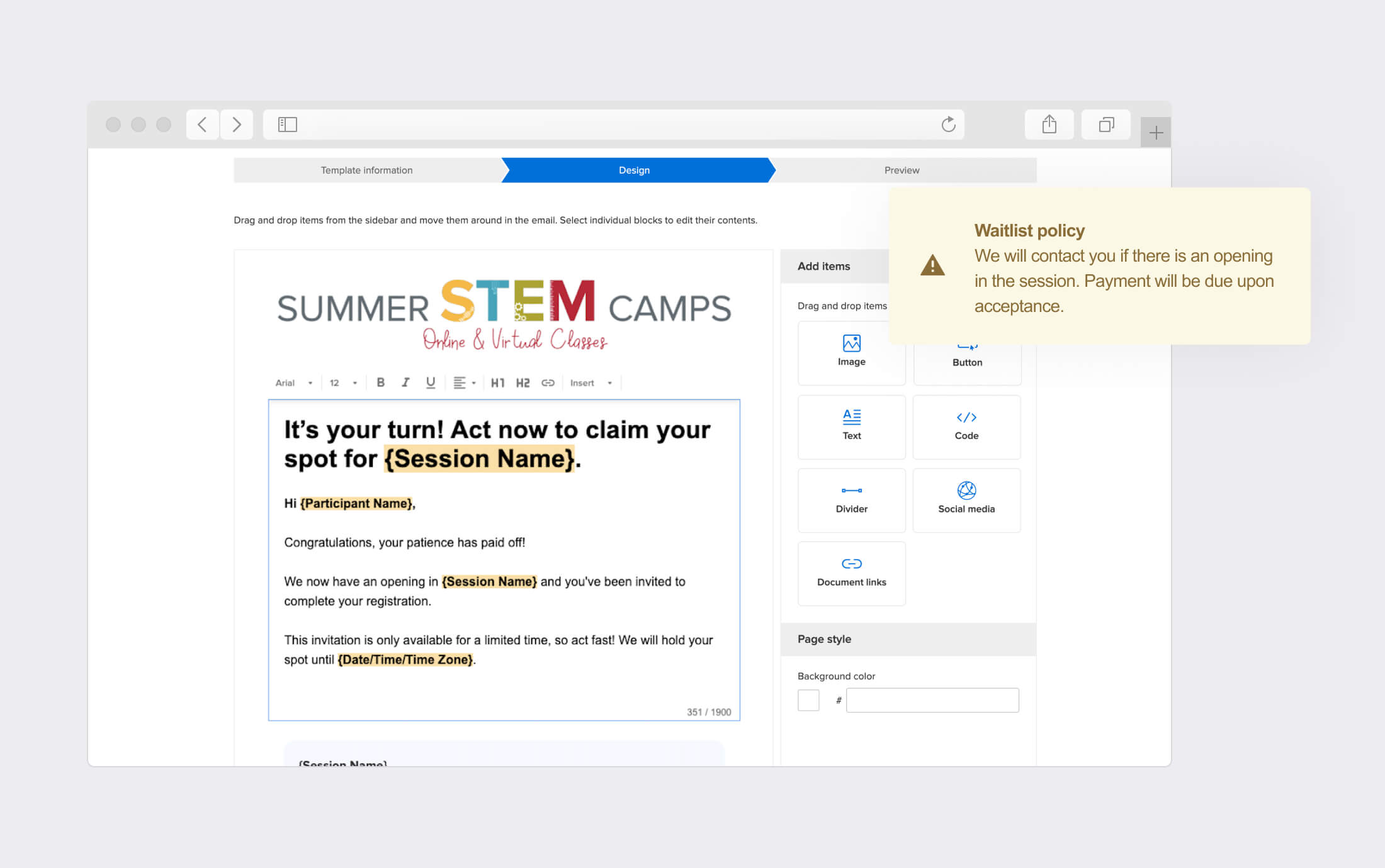 Say goodbye to manual waitlist management thanks to the automated waitlist tool. When a spot becomes available, an email invitation is automatically sent to the first registrant on the waitlist, giving them an amount of time—set by you—to accept or deny their spot. It's that easy.